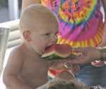 One-year-old Paxton Baer of Harwood, Mo., enjoys his first ever watermelon at the Vernon County Youth Fair on Friday. Producers Grain hauled in a stock tank full of melons on Friday afternoon and young and old alike snatched a piece and found some shade in which to savor the sweet treat... -