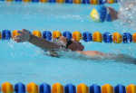 Nevada Neptunes swimmer Chosen Reichard swims the back stroke leg of the boys 8 and under medley relay during a tri-meet Wednesday afternoon with teams from Lamar and Joplin at Walton Pool. -