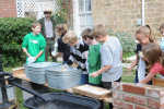 Students from Ann Whiteaker's fourth grade Truman Elementary class use lye soap, an old-fashioned wash board and galvanized tubs to do some laundry while National Park Service employee Joey Risch gives instruction and encouragement, during the Vernon County History Days held in Nevada on Thursday. ... -