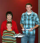 For the second year, the Nevada R-5 Board of Education asked students to submit designs for the district's Christmas Card and board members selected two cards from those submitted to be used by the district. During Wednesday night's board meeting R-5 board president Joy Hawks presents second grade student Owen Sweringen, left, and sophomore Kodee Ast, right, a certificate and a box of the cards each student designed as their prize... -
