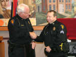 Nevada Police Chief Graham Burnley presents a Chief's Commendation to Sgt. Steve Bastow during last night's city council meeting. Burnley told the council that he does not give a lot of awards, but when he does, he "gives awards to people who don't give up." According to the commendation, Bastow received a radio call about 5 a.m. ... -