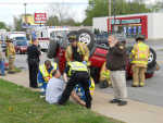 Brian Norton of Nevada, wearing the T-shirt, is attended to by police officers and firefighters after his westbound 2006 Jeep overturned at Oak Street and Austin Boulevard about 5 p.m. Friday. Norton said he was not seriously injured. -