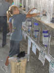 Emily Sutton of El Dorado Springs and the Hustlers 4-H Club returns her rabbit to its cage after Thursday judging at the Vernon County Youth Fair. The annual event continues at 9 a.m. today with beef cattle showmanship and 10:30 a.m. with the "Heart and Hands" program. Beef cattle judging begins at 4:30 p.m... -