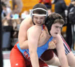 Nevada freshman Trey Pritchett tries to put Jeremiah Ukens on his back minutes before Pritchett succeeded in pinning Ukens for third place at 197 pounds in the Nevada junior varsity wrestling tournament at Nevada High School Saturday. Full tournament results were not available at press time Monday...
