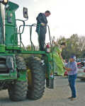 Combining at Bronaugh to make a grand entrance! Junior, Kasen Pitts looks down at his date, senior, Lindsey Reedy as she is assisted down by Dave Reedy, Lindsey's dad. The owner of the combine, Mike Byram, agreed to let Pitts use the combine on the condition he first cleaned it until it was gleaming. The combine looked good, and the couple even better!... -