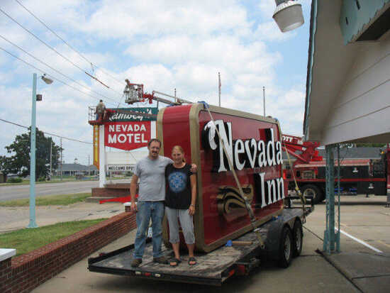 Blankenship said he had helped design the new red and white Nevada Inn sign being installed Friday by Missouri Neon Co. workmen from Springfield. "That old neon tubing was so expensive to replace that the new sign only cost half as much as it would have to maintain the old one," he said.